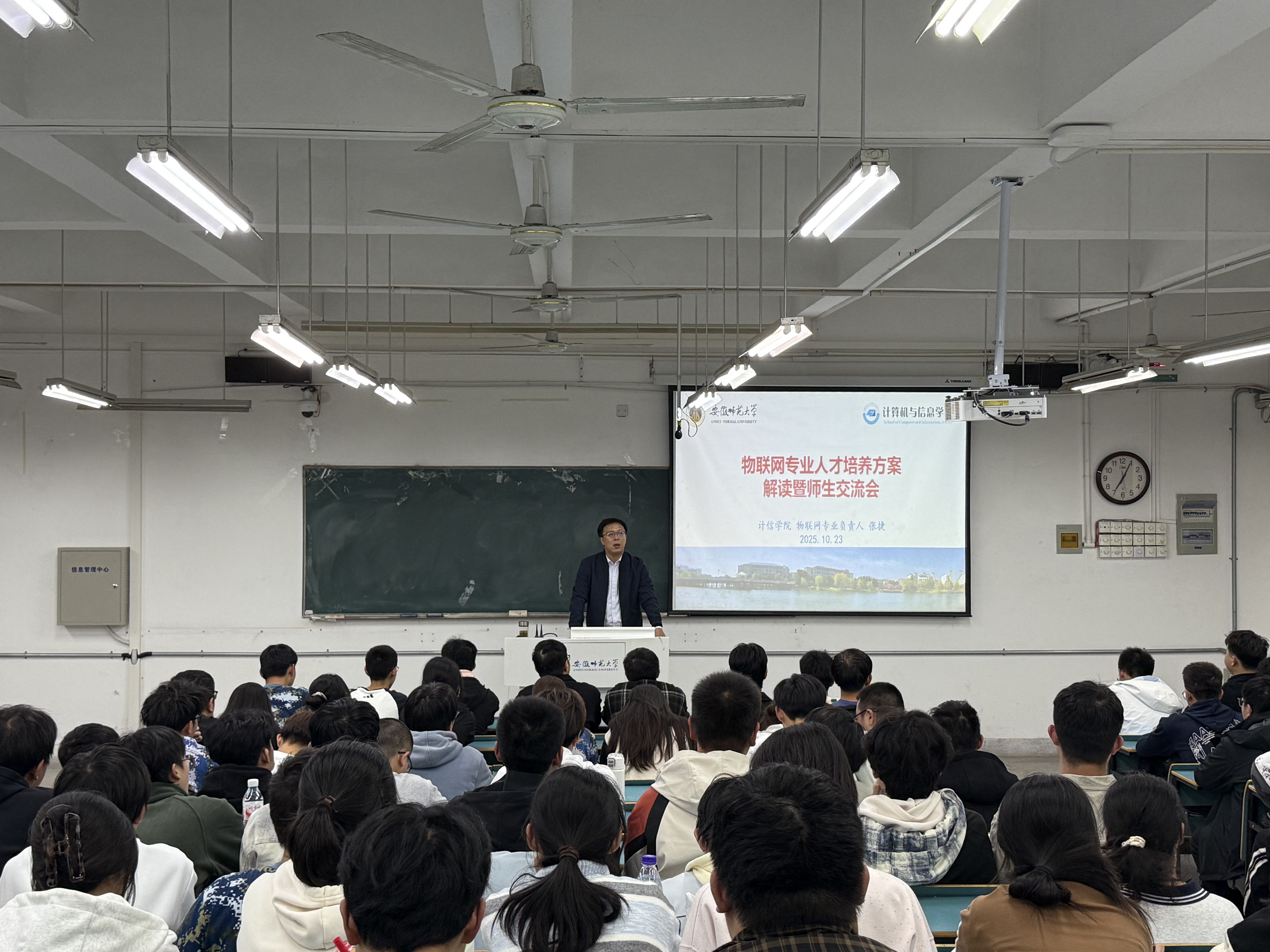 为帮助 2025 级新生精准把握专业定位、明晰成长路径,2025年10月23日,402cc永利集团在2070101教室成功举办2025级物联网工程专业人才培养方案解读暨师生交流会。物联网专业负责人张捷老师围绕专业发展、课程体系、实践平台与学业发展路径,为新生带来了一场内容丰富、导向明确的人才培养解读会。本次解读会特别突出“魅力导师团”的引领作用,展现学院在个性化培养与全程化育人方面的积极探索。