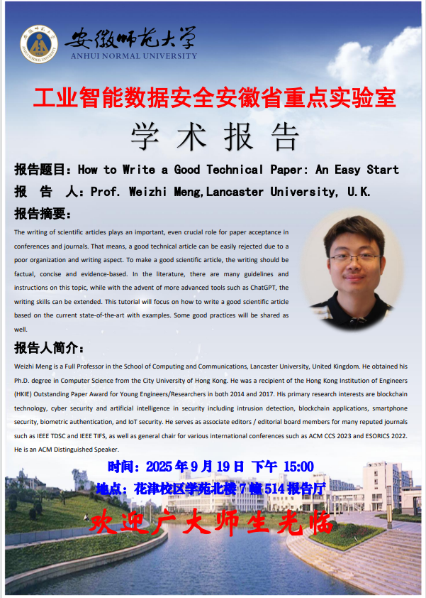 【学术预告】工业智能数据安全安徽省重点实验室学术报告:How to Write a Good Technical Paper: An Easy Start