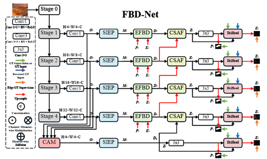 为了解决这个问题,本文提出了一个新颖的前景-背景解耦网络,该网络增强了前景-背景的分离学习以提高可判别性。具体而言,本文设计了一个边缘引导的前景-背景解耦模块,该模块有助于前景和背景表示的分离学习。此外,本文引入了前后背景的表征学习,通过设计解开头以进一步增强模型的判别能力。该解开头由两个目标组成:边缘目标和前-背景分离目标。进一步,本文提出了三个互补模块:用于初始粗目标检测的上下文聚合模块,用于多尺度信息学习的尺度交互增强金字塔模块以及用于细微线索累积的跨阶段自适应融合模块。广泛的实验表明,本文基于卷积神经网络骨干和基于Transfomer骨干的网络模型超过了在四个公共数据集上的26个最先进的伪装目标检测方法。该成果现已被ACM Transactions on Multimedia Computing, Communications and Applications期刊在线发表https://dl.acm.org/doi/10.1145/3768584(DOI:10.1145/3768584),青年教师吴杰胜博士为论文第一作者,402cc永利集团为第一完成单位。