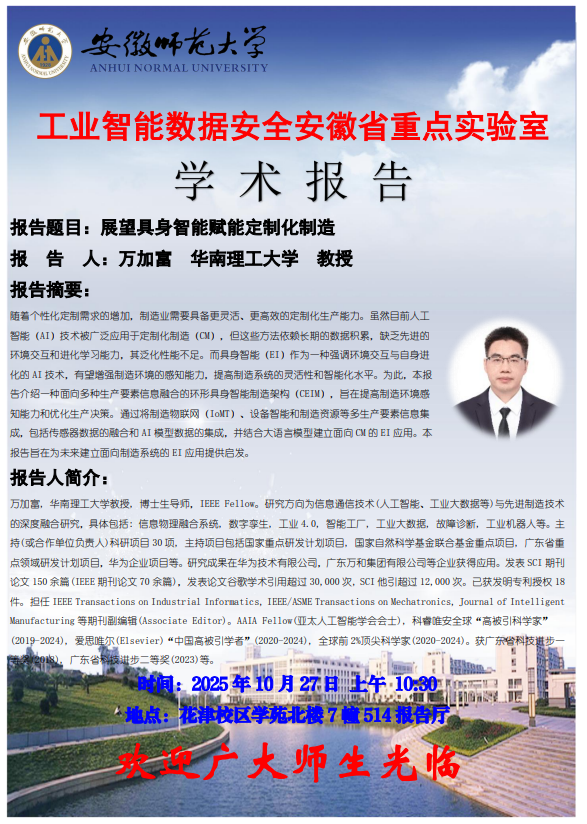 【学术预告】工业智能数据安全安徽省重点实验室学术报告:展望具身智能赋能定制化制造